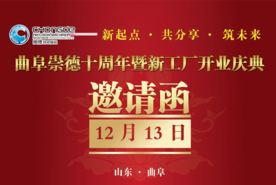 孔子曰:“有朋自遠方來,不亦樂乎!”感謝您對曲阜崇德的信任與支持,我們希望可以與您繼續攜手,再創輝煌!竭誠邀請您前來參加曲阜崇德新工廠開業與十周年慶典活動,全面感受到一個生機盎然、蓬勃發展的曲阜崇德!